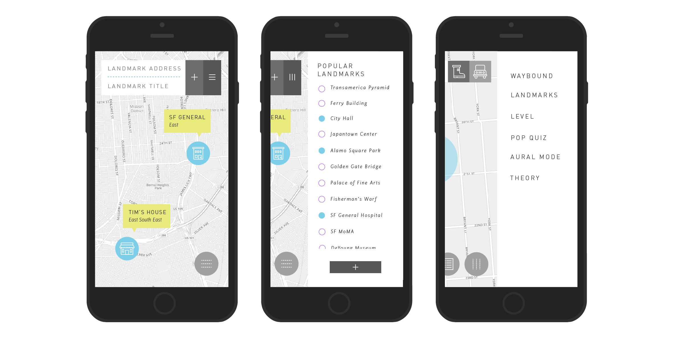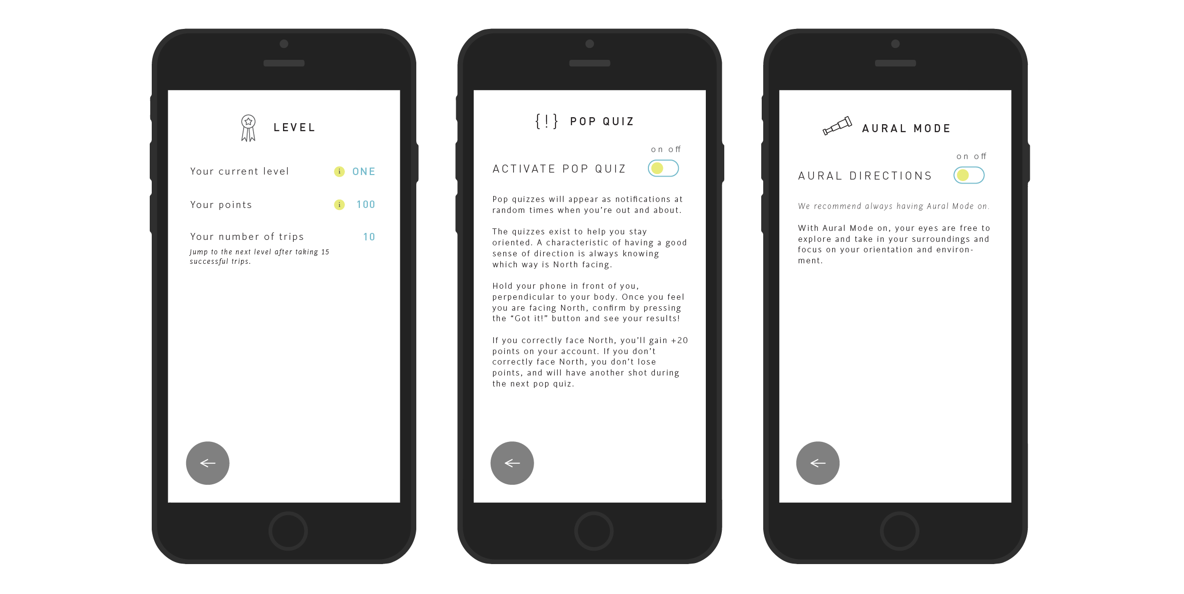 When given the task to create a wayfinding product, I decided to create an app that allows users to build and test their directional skills as they wayfind and orient within their environment. From my research, I decided the use of cardinal directions, gamified levels, and pop-quizes would keep it fun and productive for users. This new form of wayfinding will hopefully allow users to decrease their reliance on GPS, increase their awareness of their environment, and enable them to tap into their sense of direction as they hadn’t before.